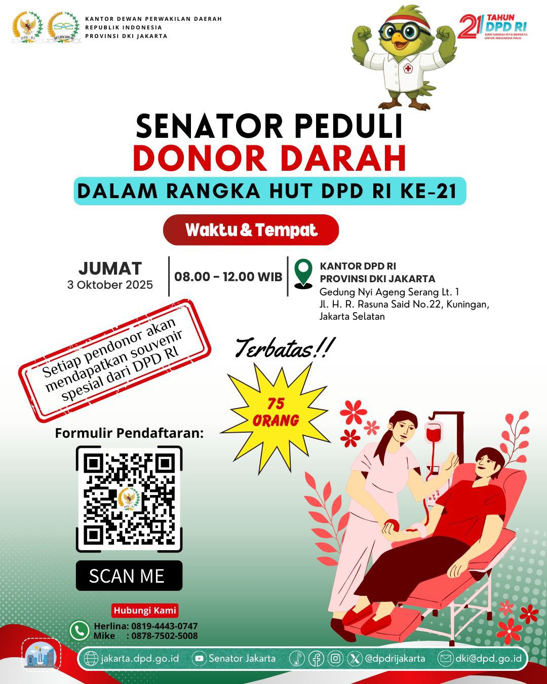 "Buat warga Jakarta, mari kita berpartisipasi dalam kegiatan Senator Peduli Donor Darah dalam rangka HUT ke-21 DPD RI. Ini adalah kegiatan dari kita untuk kita. Bentuk nyata kepedulian senator," tuturnya, Rabu (3/9/2025), di Jakarta.