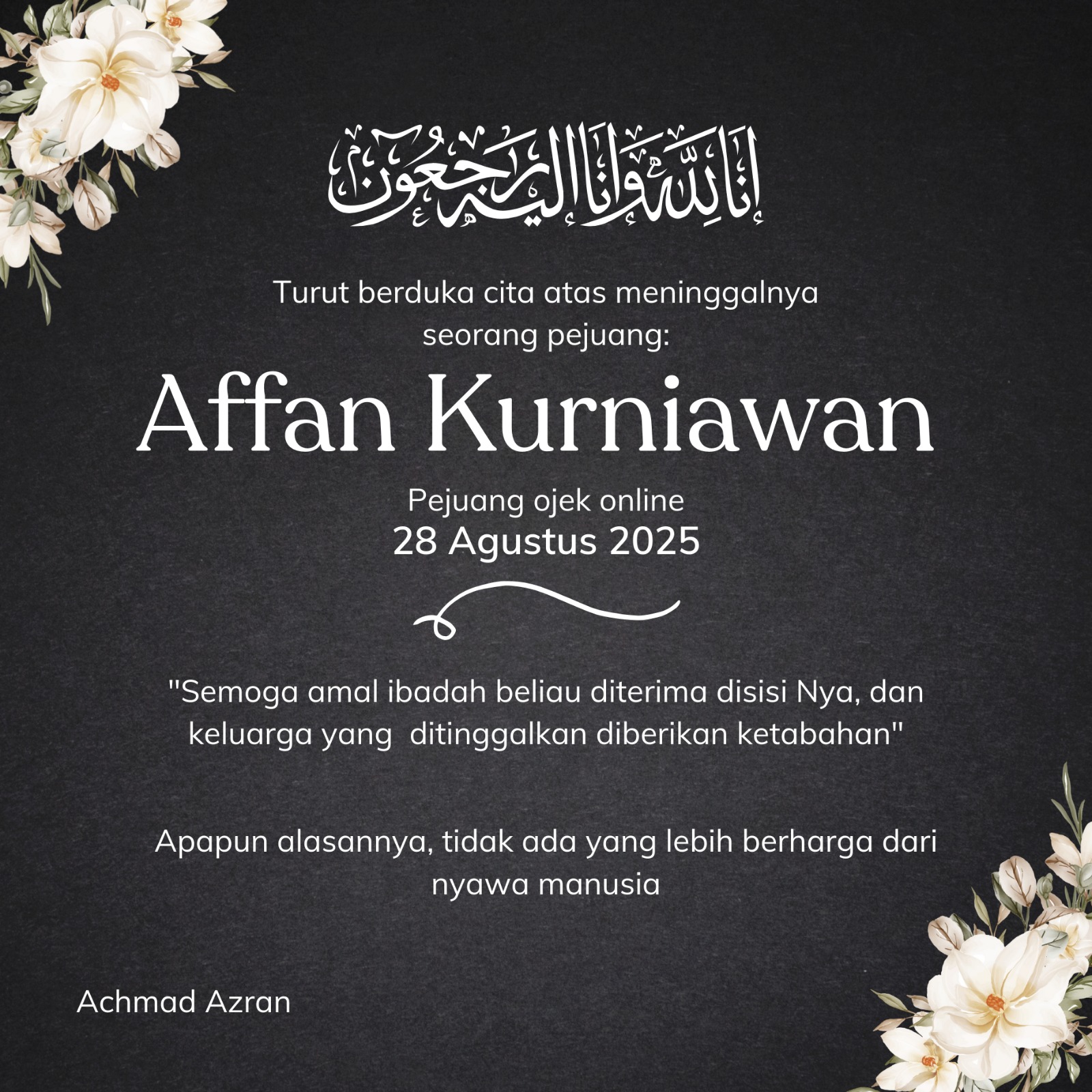 Bang Azran juga mengajak masyarakat Jakarta, mahasiswa, serta komunitas ojol untuk turut mengawal proses hukum dengan cara yang tepat.